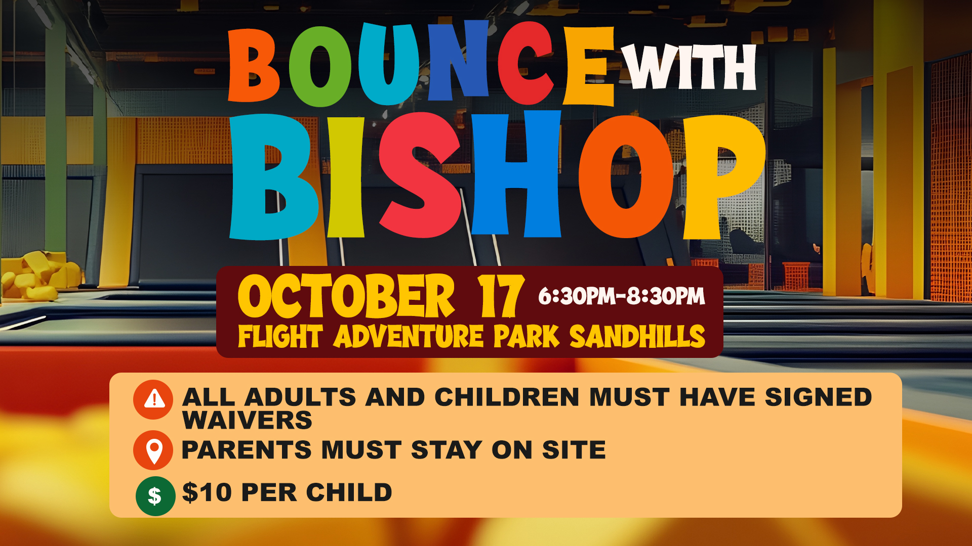 Join us at Flight Adventure Park for a night of fun and excitement! Kids ages 3–11 can enjoy trampolines, bounce houses, and more for just $10 per child.